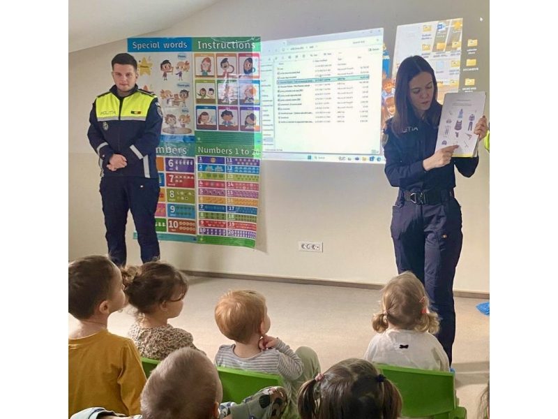 Poliţiştii de prevenire și cei rutieri le-au prezentat copiilor principalele reguli de circulație rutieră, indicatoarele rutiere, aspecte privind trecerea pentru pieton, le-au explicat semnificaţia semaforului electric pentru pietoni.