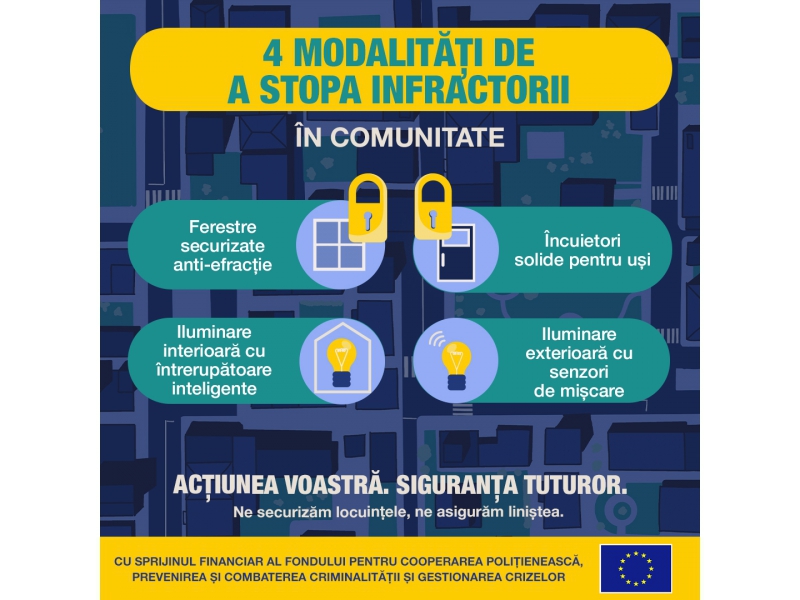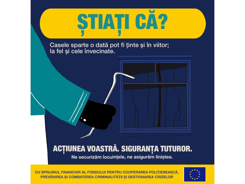 La data de 18 iunie a.c. este marcată Ziua Europeană de prevenire a furturilor din locuințe prin activități de informare preventivă a cetățenilor. Acest eveniment este inițiat de Rețeaua Europeană de Prevenire a Criminalității (E.U.C.P.N) și implementat de Institutul de Cercetare și Prevenire a Criminalității, în calitate de Punct Național de Contact și are ca scop conștientizarea de către cetățeni a necesității adoptării unei atitudini prudente, în raport cu locuința și bunurile proprii, precum și a consecințelor ce decurg din neadoptarea măsurilor preventive adecvate.