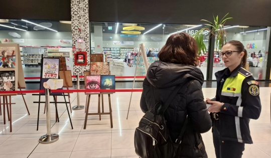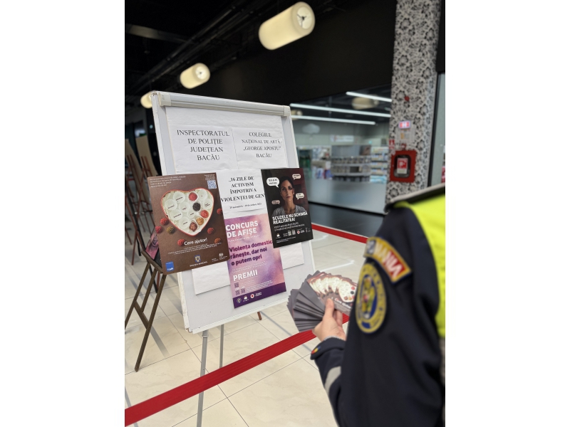 Totodată, în cadrul activităților preventive, în perioada 28 noiembrie - 05 decembrie a.c., în același centru comercial au fost expuse lucrările realizate de elevii Colegiului Național de Arte „George Apostu” Bacău, în cadrul concursului cu tema „Violența domestică rănește, dar noi o putem opri”.