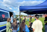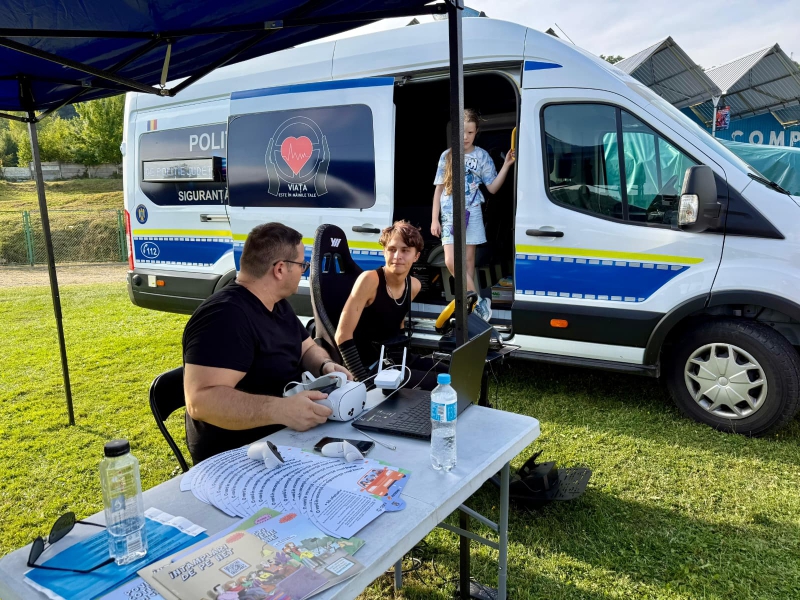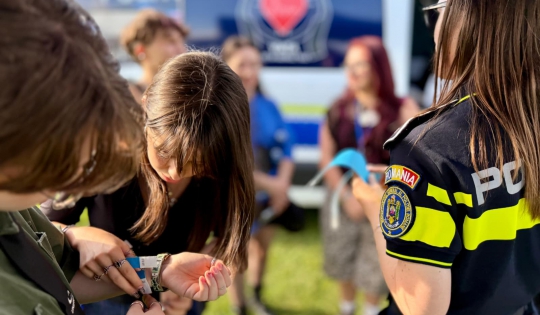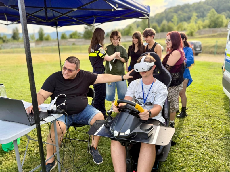 • Simulatorul auto, dotat cu scaun, volan și ochelari VR, unde participanții au experimentat efectele consumului de alcool sau droguri la volan, în condiții de siguranță. De asemenea, polițiștii au distribuit materiale preventive din campaniile „SAFE SUMMER” și „Alege legal, chiar și-n vibe de festival!”, precum și evantaie și brățări cu mesaje de siguranță, pentru a le reaminti tinerilor că distracția și responsabilitatea trebuie să meargă împreună.